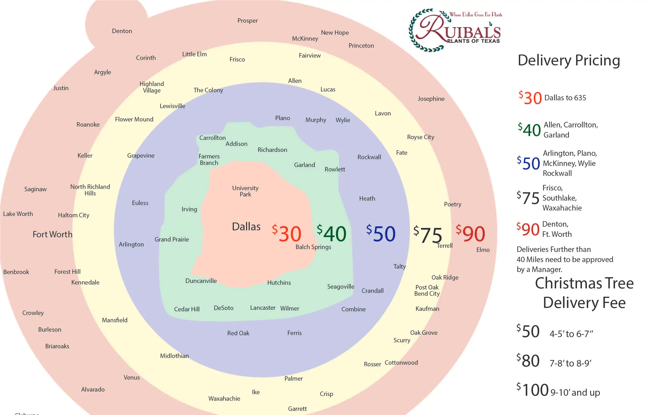 Christmas tree deliveries $50-200 depending on size and distance. Please be ready with any floor coverings as we may not have them on the trucks.